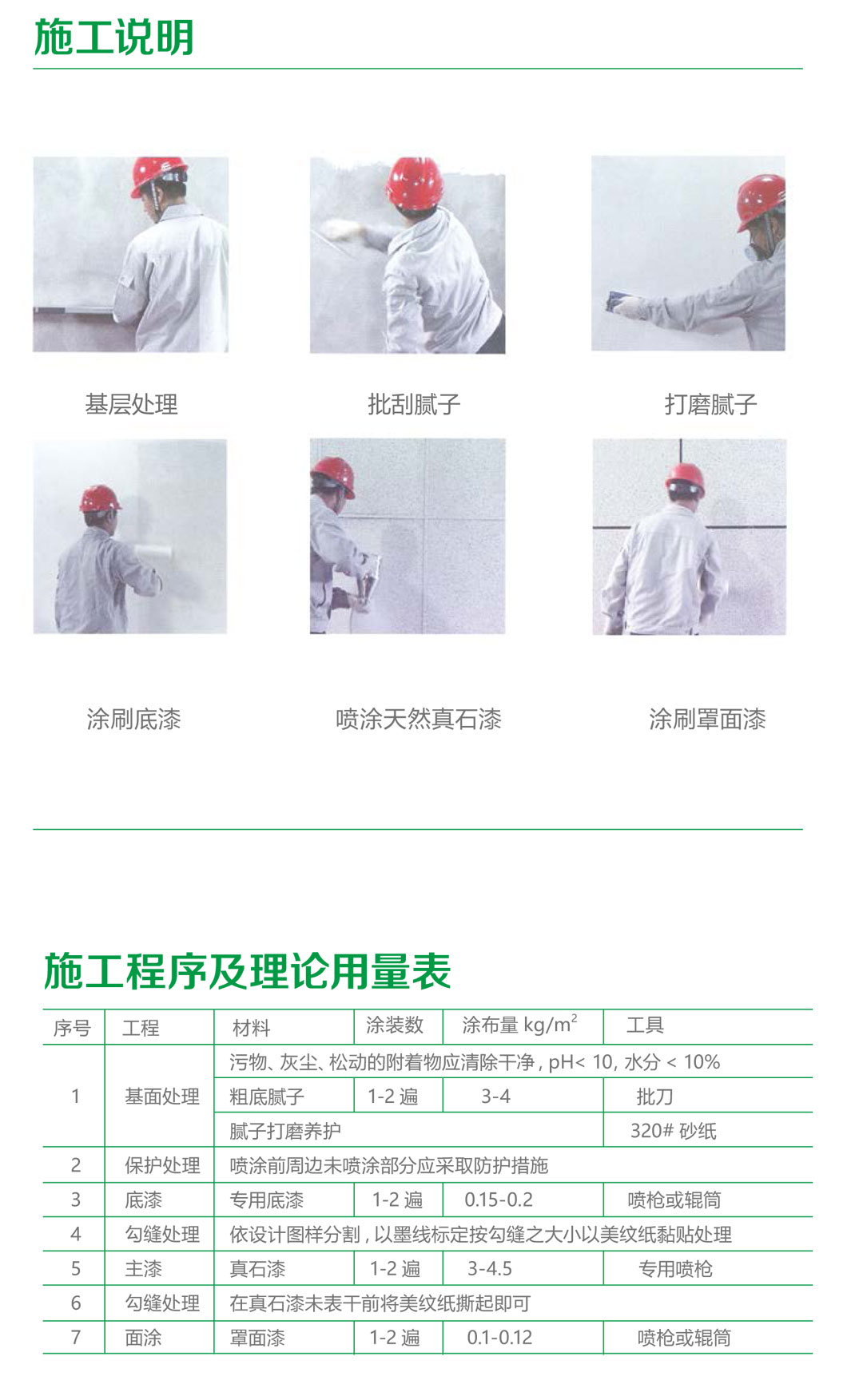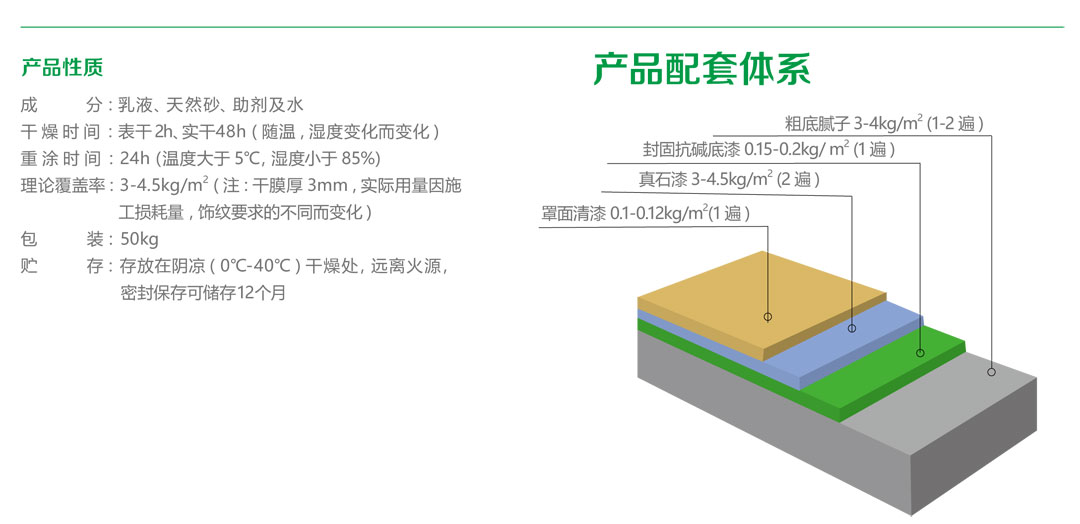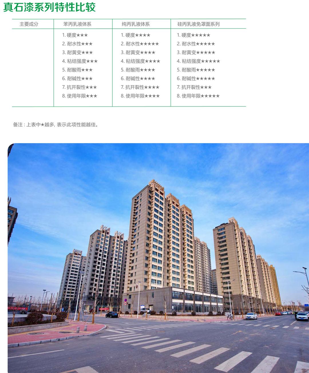 天然真石漆是由環保型高分子乳液聚合物和能構成仿石材紋理的天然大理石骨料、助劑等材料組成的厚質涂料 , 其外觀如石頭一般自然、穩重、氣派并且附著牢固 , 具有優異的耐候性、憎水透氣性、柔韌性和抗沖擊性 , 符合國家規定的 JG/T24《合成樹脂乳液砂壁狀涂料》標準。其裝飾性具有很強的仿石材及歐式風格效果 , 是當今社會高檔小區、別墅、公共建筑的主流裝飾材料。適用于所有平整的建筑物內、外墻礦物質材料基層 ,同時也是外墻外保溫體系理想的面層裝飾材料。